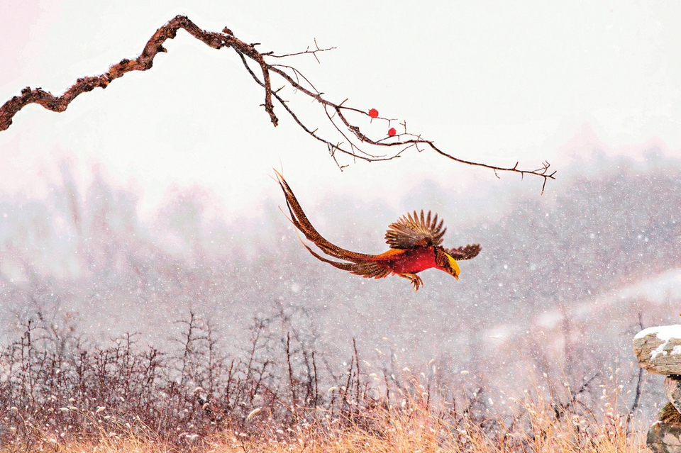 运城市盐湖区,红腹锦鸡正在山林间穿梭觅食,为苍茫山野增添灵动生机。
