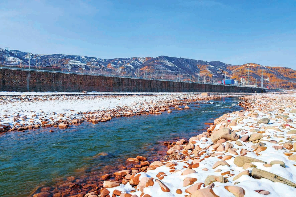 沁水县端氏镇沁河沿岸雪石相间,清澈河水缓缓流淌。