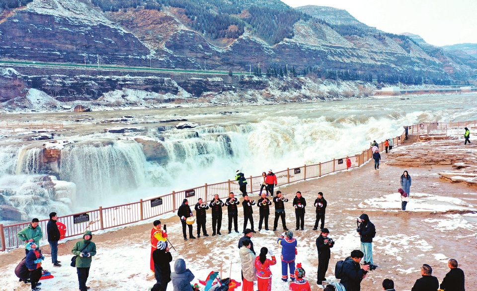 吉县黄河壶口瀑布景区,众多游客正在赏雪景、观瀑布、看表演。