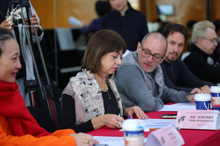 2025年10月,第九届国芭赛评委会主席、格鲁吉亚国家芭蕾舞团团长妮娜·安南拉斯维利(左二)同其他国际评委进行比赛评审工作。