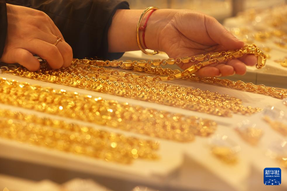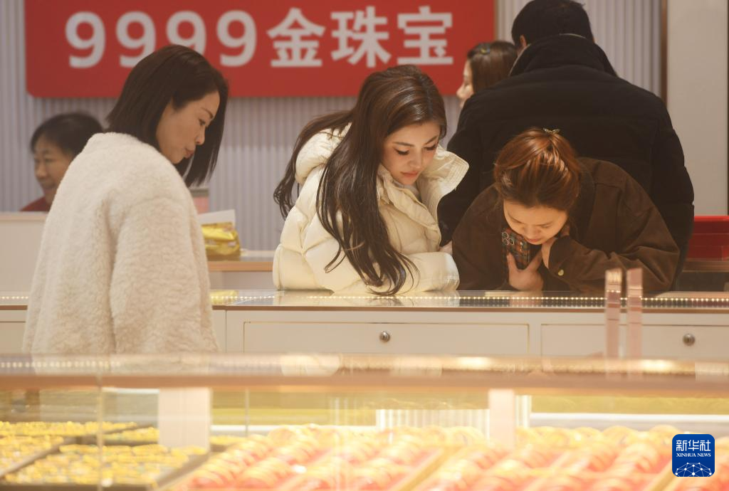 1月29日,顾客在浙江省杭州市的一家金店选购金饰。