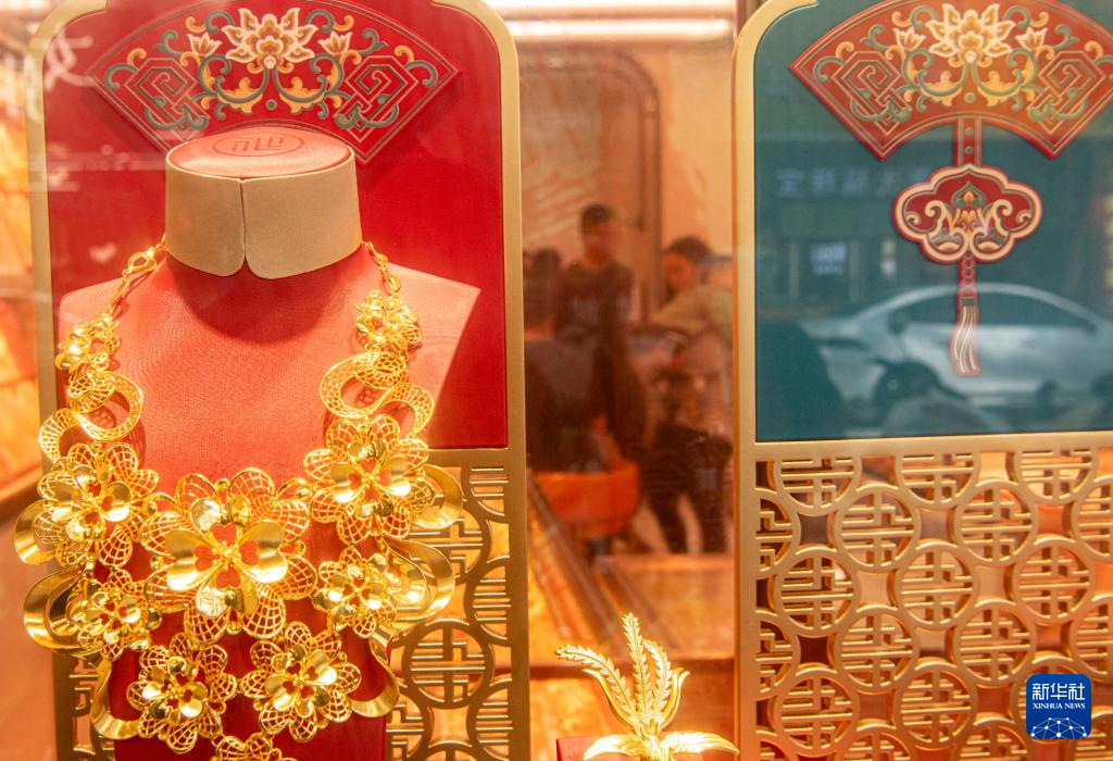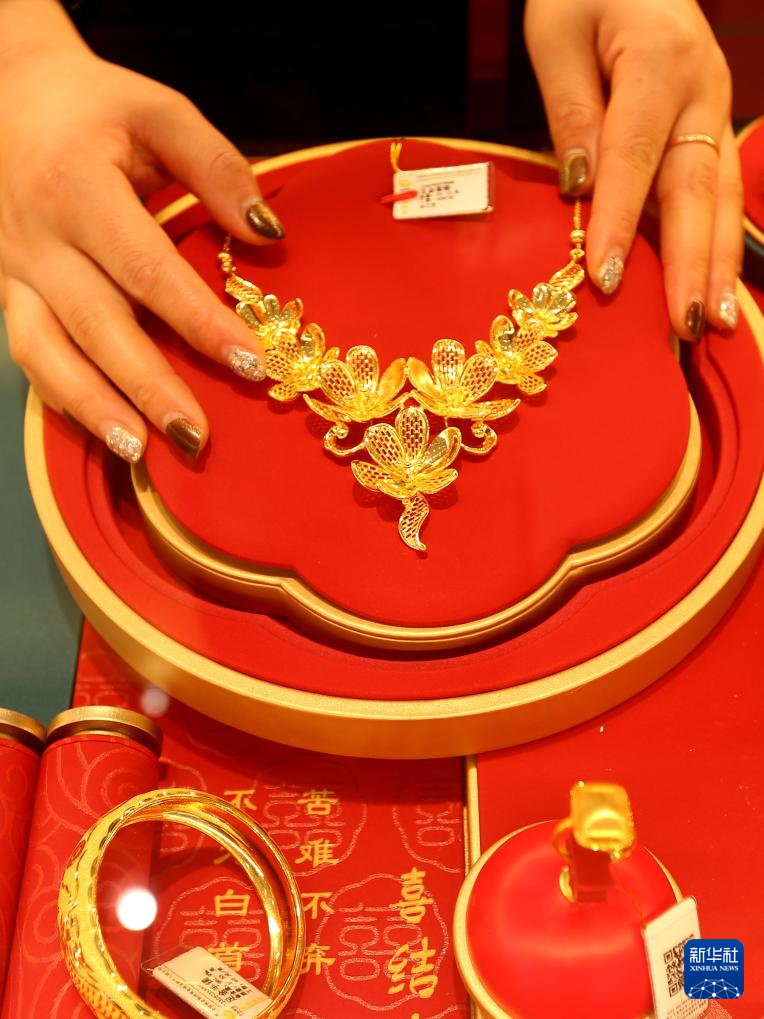 1月29日,顾客在浙江省湖州市德清县禹越镇的一家金店挑选黄金首饰。