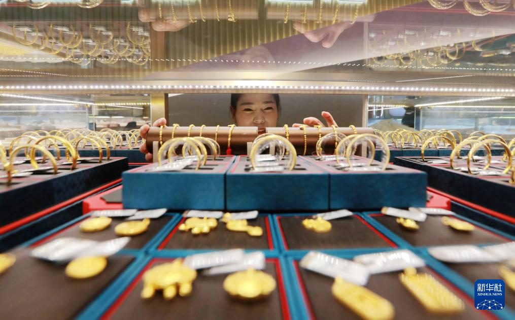1月29日,在江苏省扬州市竹西街道的一家金店,店员在整理黄金首饰。