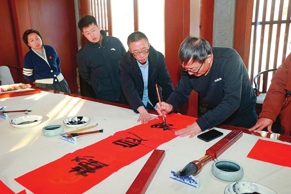 长案另一侧,大同市书法名家胡金来运笔从容,隶书“北魏传承古韵延千秋文脉兰园赓续芳华接万代风流”舒展如流云,“春联本就是中华笔墨里最接地气的艺术,”胡金来笑着说,“这红纸上的字,一撇一捺都藏着咱百姓对新春的期盼。”
