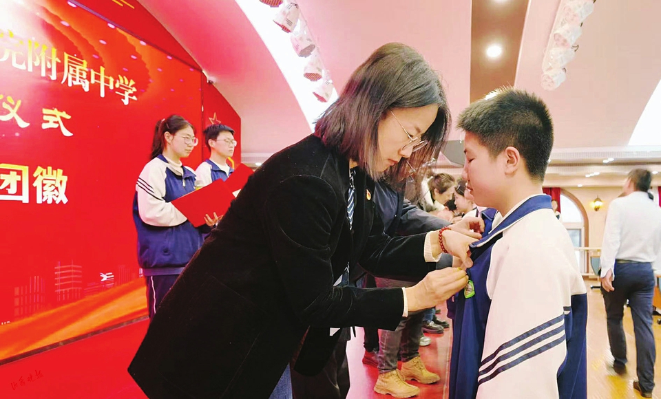 为凝聚青春力量、传承红色基因,引导广大青年学生坚定理想信念、勇担时代使命,近日,太原师范学院附属中学举行新团员入团仪式。 仪式上,校领导与优秀学生代表、各班团支书为新团员佩戴团徽。随后,全体新团员庄严宣誓,铿锵有力的誓言响彻会场、激荡人心。宣誓完毕,600名同学正式成为中国共产主义青年团的一员。