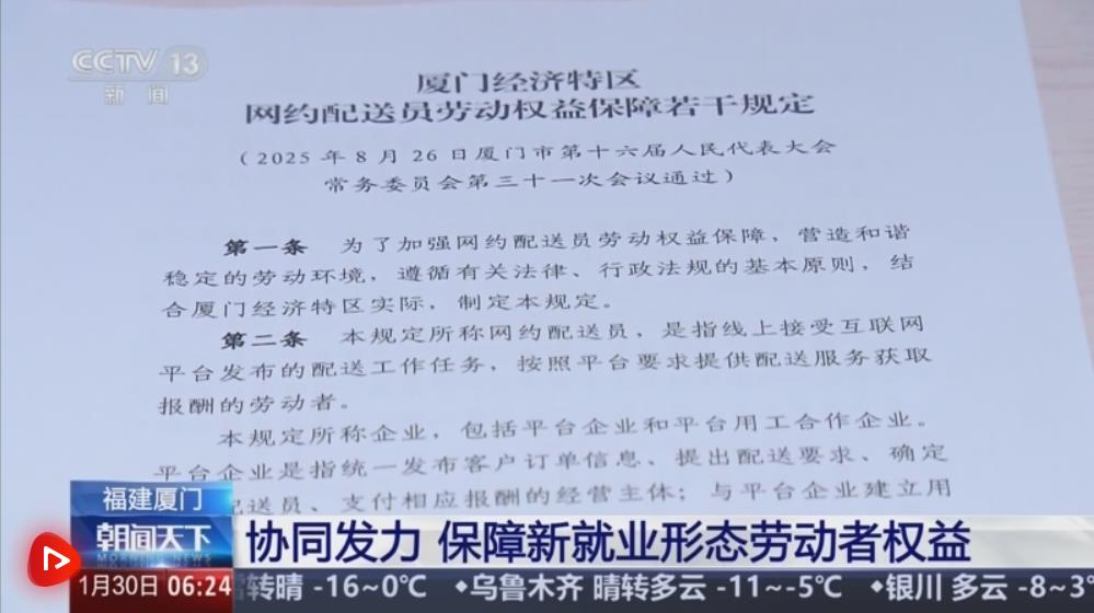 央视网消息:目前,福建厦门共有网约配送员约10万人。2026年1月1日,《厦门经济特区网约配送员劳动权益保障若干规定》正式施行,为网约配送员依法维权提供更稳定的制度支撑。
