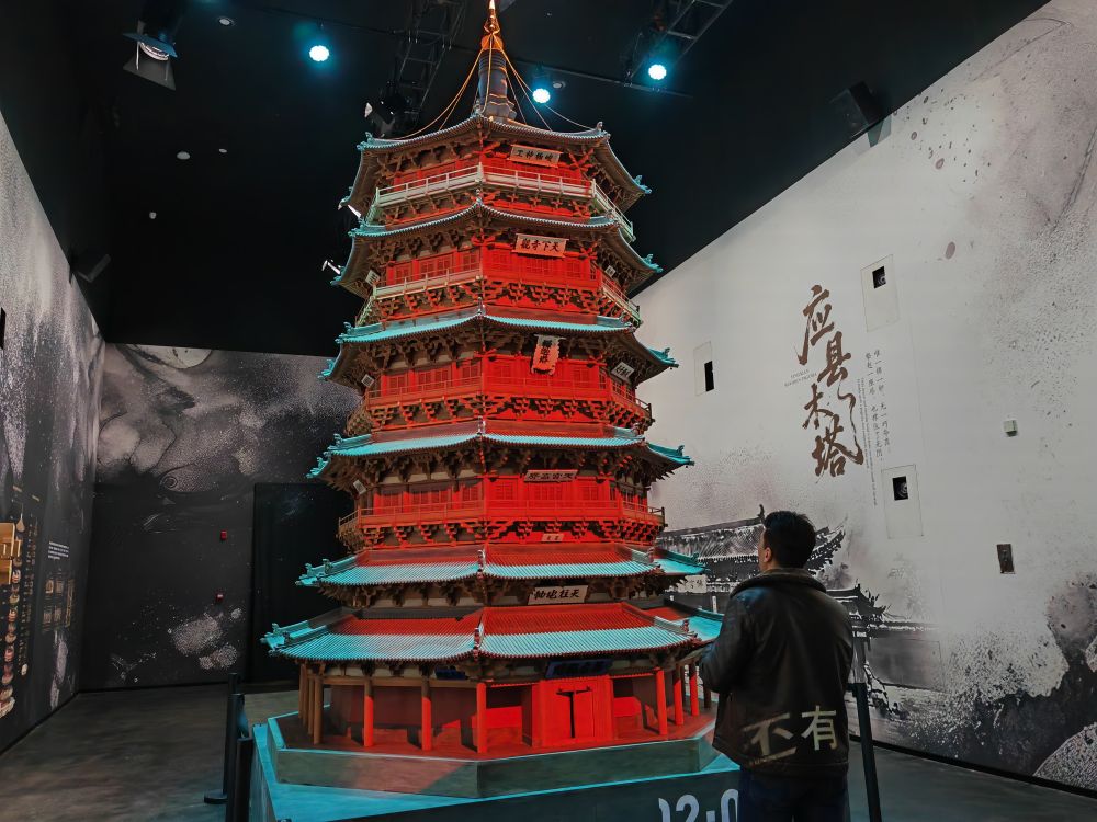 1月14日,在山西省太原市举办的“《黑神话:悟空》遇见山西——古建数字艺术展”上,一名埃及留学生在参观应县木塔模型。新华社记者 解园 摄