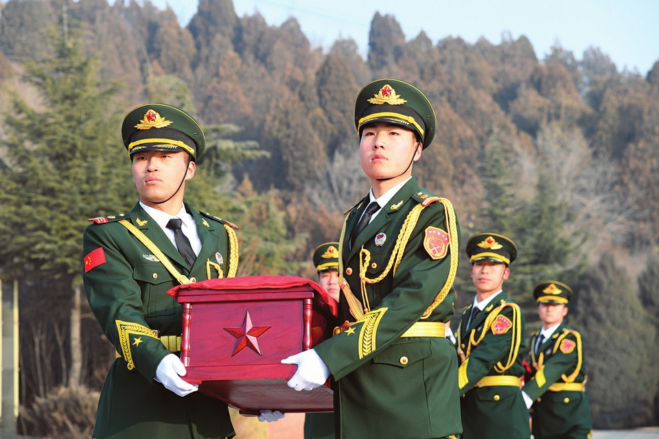 仪式现场,松柏肃立,在深沉凝重的乐曲中,礼兵迈着庄严正步,护送覆盖鲜艳国旗的烈士棺椁缓步前行。全体人员列队肃立,奏唱国歌,并向烈士遗骸默哀,深切缅怀为国捐躯的革命先烈。