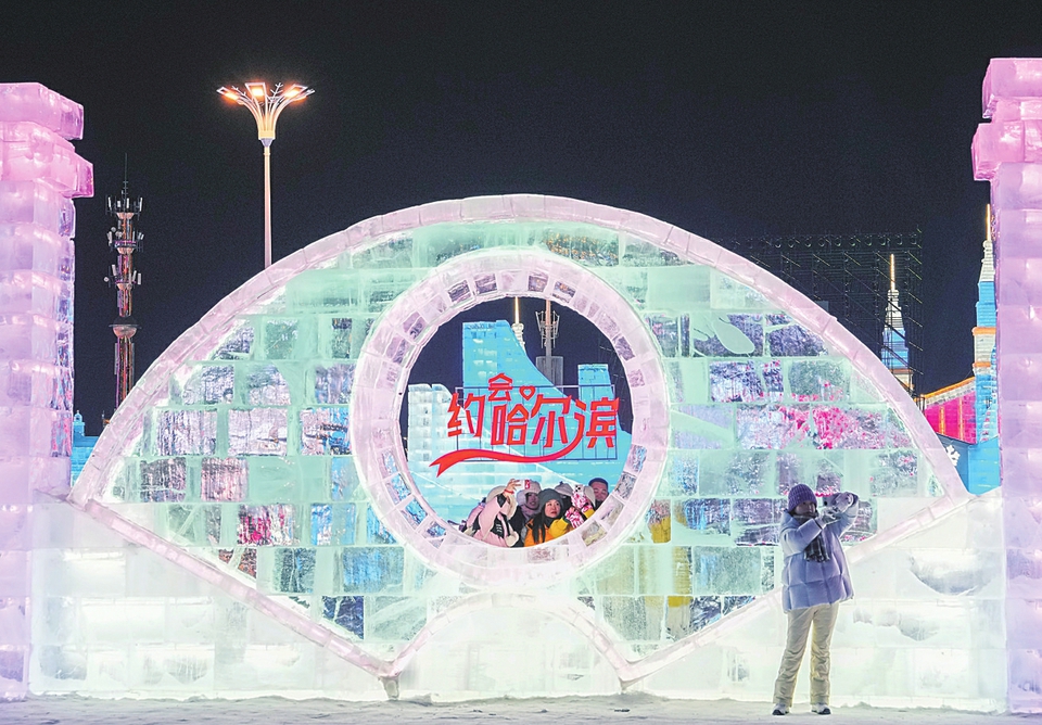 游客在哈尔滨冰雪大世界园区拍照。新华社记者王建威摄
