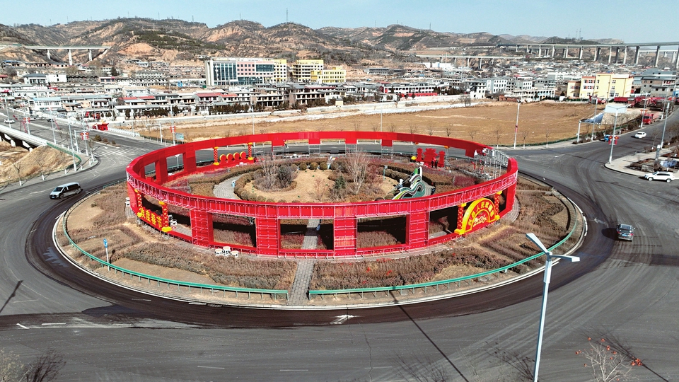 1月30日,兴县高速路口环岛处,工人们正加紧安装大型迎春灯饰。醒目的红色主体结构为即将到来的马年春节营造出浓厚的节日氛围。