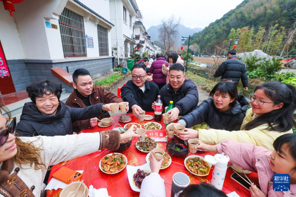 2月1日,当地百姓和游客在莲花镇戴家村品尝百家宴。