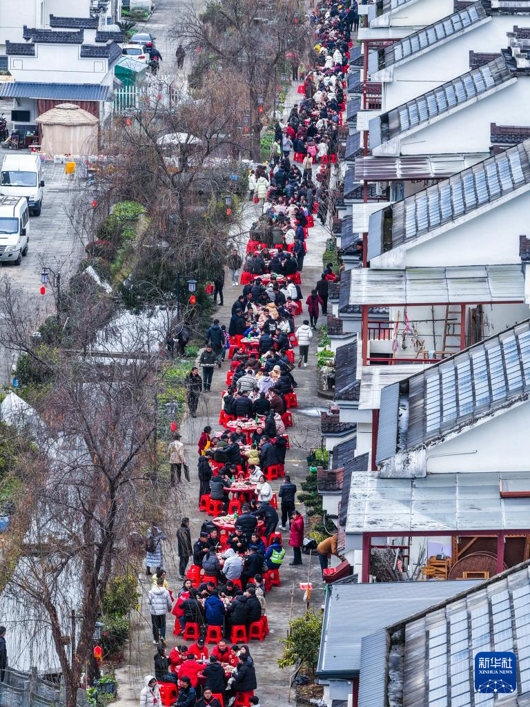 2月1日,当地百姓和游客在莲花镇戴家村品尝百家宴(无人机照片)。