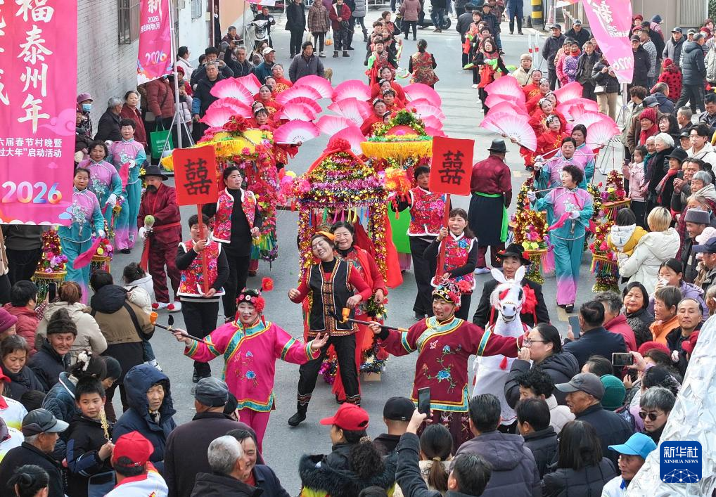 2月3日,演员们在江苏省泰州市海陵区城东街道唐甸村村头进行民俗表演(无人机照片)。