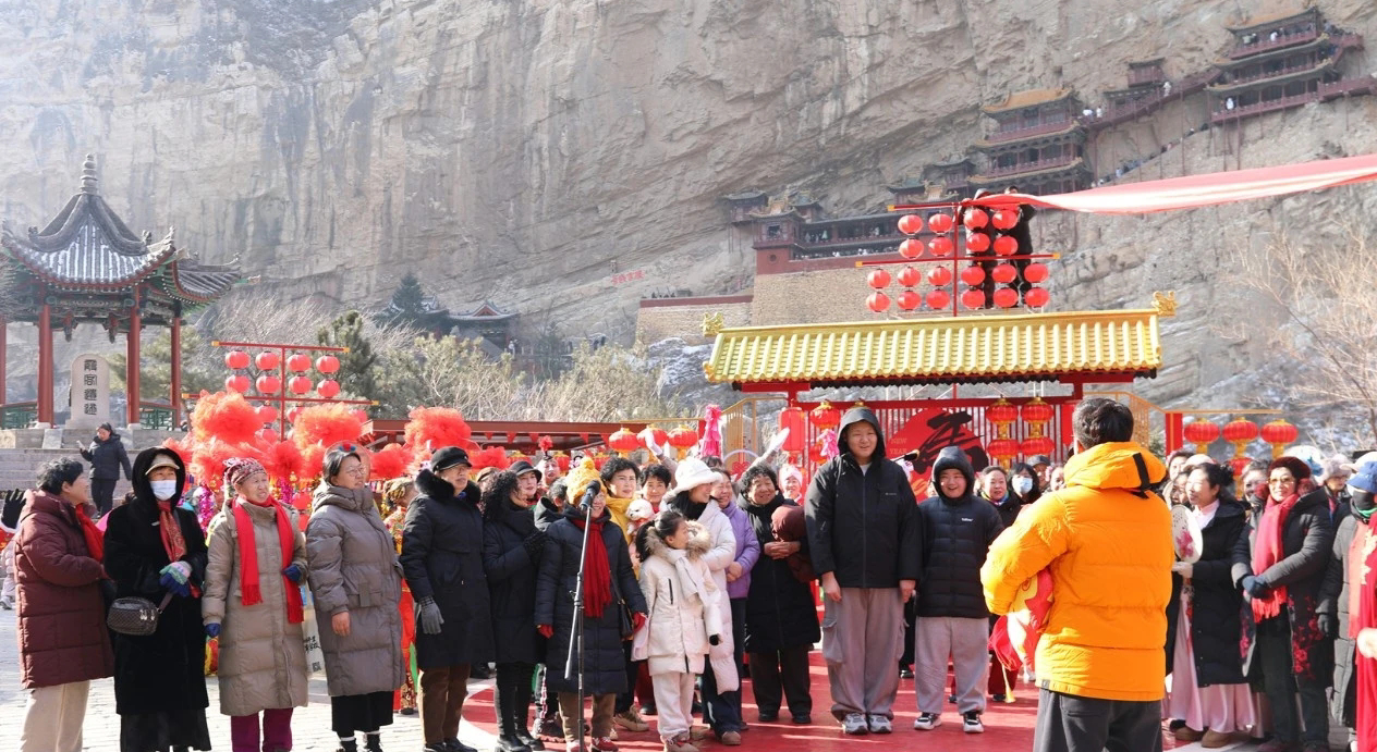 2月1日,“大地流彩·和美乡村庆丰年”2026全国农民群众新春联欢活动在浑源县主会场大操场及分会场悬空寺同步开展彩排工作,千年古刹与浑源民俗交相辉映,提前奏响新春乐章,为全国观众呈现独具浑源特色的乡土年味。