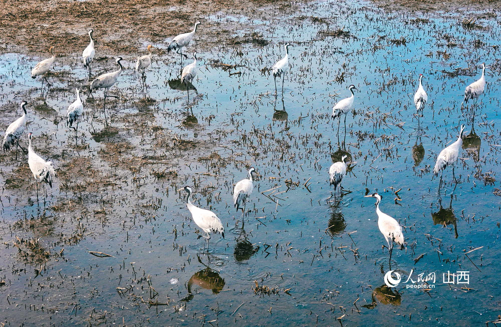 桑干河国家湿地公园附近停留的灰鹤。人民网记者王帆摄