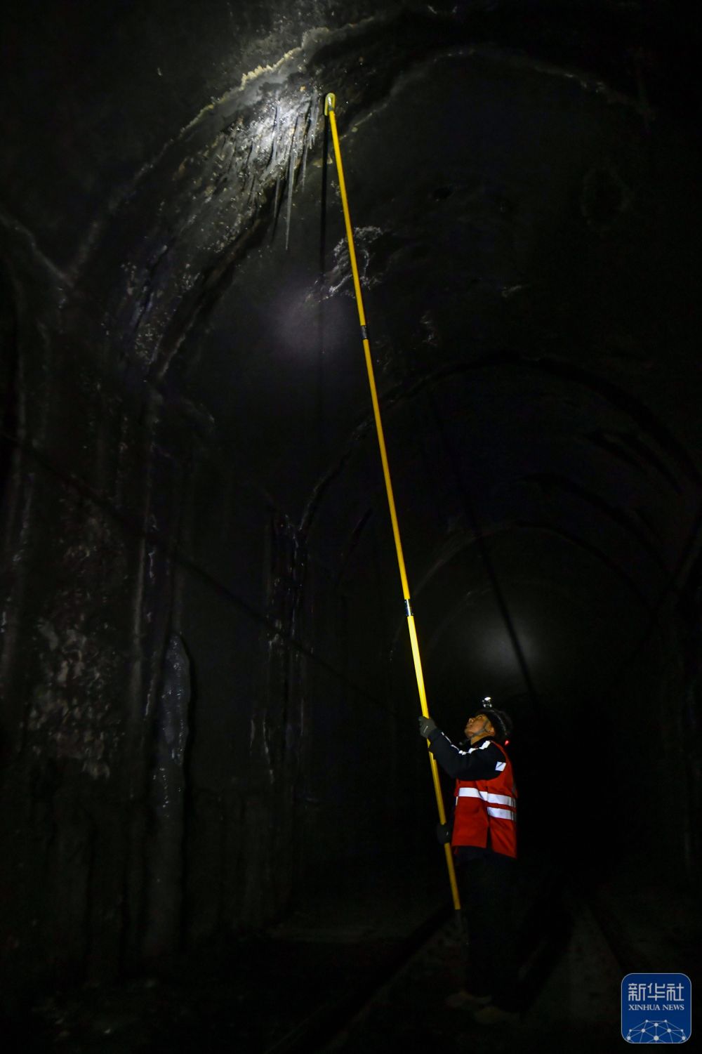 ↑ 2月3日,桥隧工申军谊在隧道里打冰。