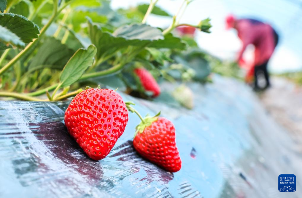 2月4日,在江苏连云港经济技术开发区朝阳街道西庄村一处大棚里,农民在采摘草莓。
