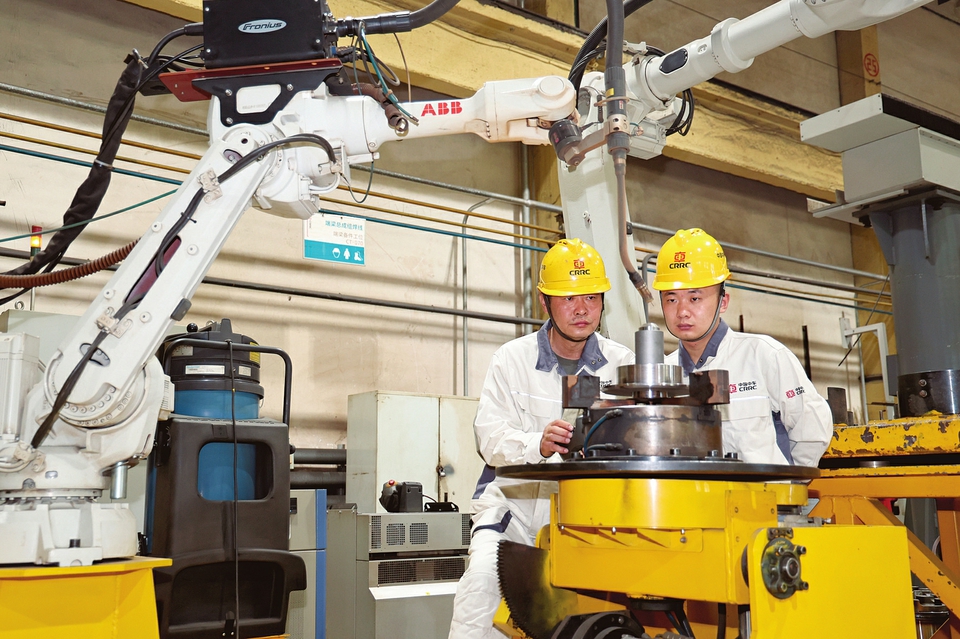 另一边,全国技术能手王大龙手持示教器,机器人手臂随之平稳移动,机车前端梁上随即焊出了均匀饱满的焊缝。王大龙说:“机器干重复活、精细活,人干判断活、创新活。”转过身,他教导身边的徒弟,“焊接参数要根据材料、环境动态调整。我们既要会‘指挥’机器,更要掌握背后的工艺逻辑。”
