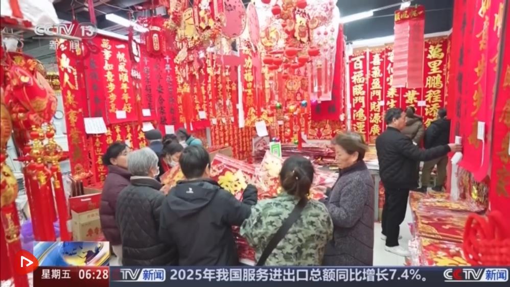 走进江西南昌万寿宫年货市场,春联、福字、窗花、红灯笼等寓意美好、喜庆吉祥的新年饰品摆满各家摊铺,各类马年元素的年货最受市民喜爱。