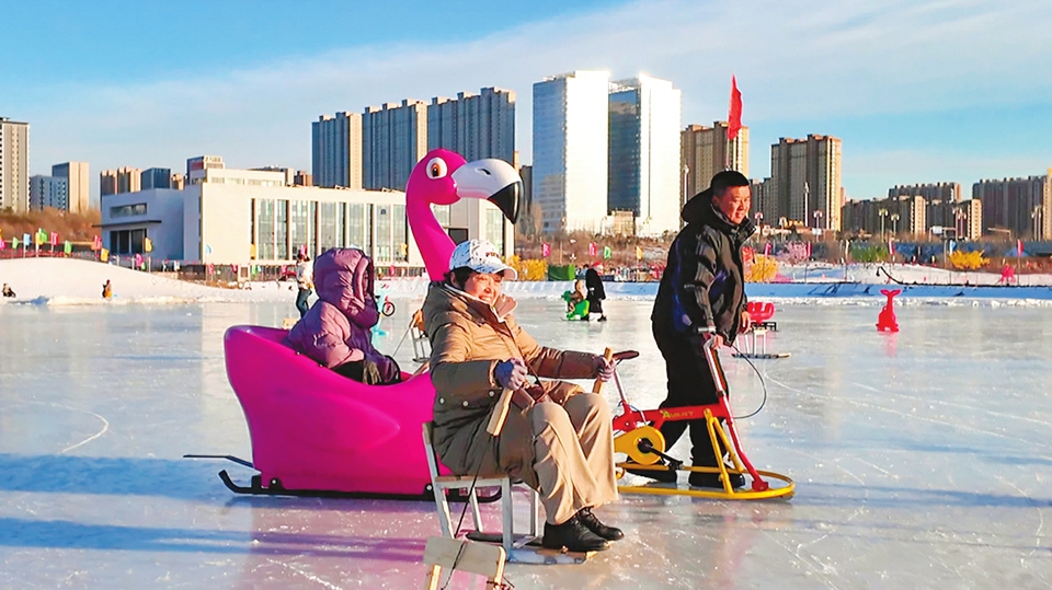 御河冰雪大世界,享受冰车快乐的人们脸上洋溢着开心的笑容。