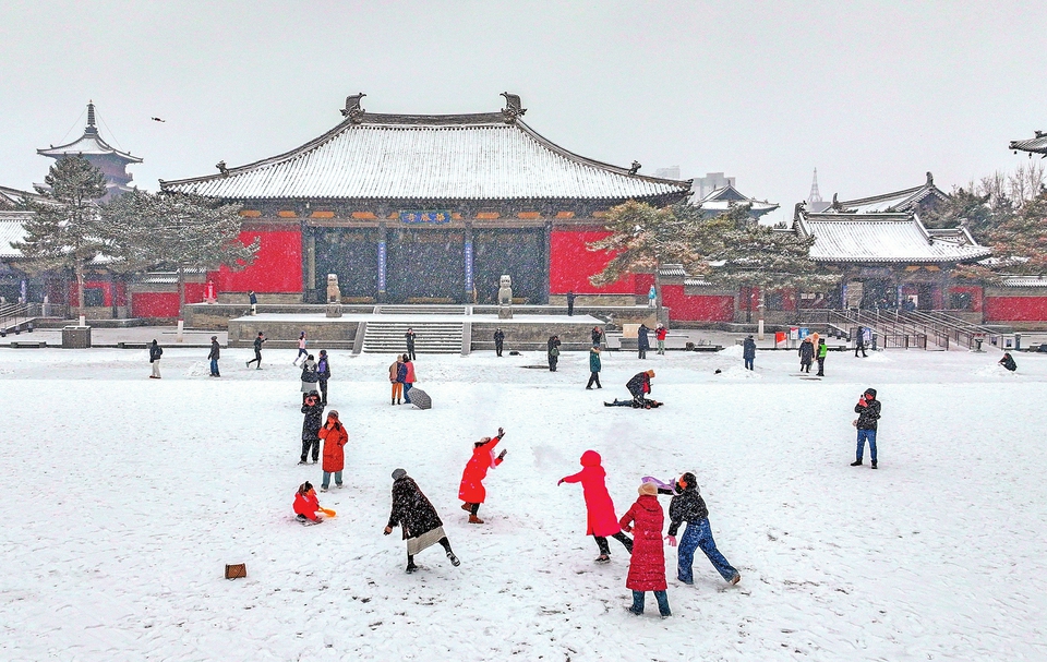 雪后,市民游客在华严寺广场嬉雪。