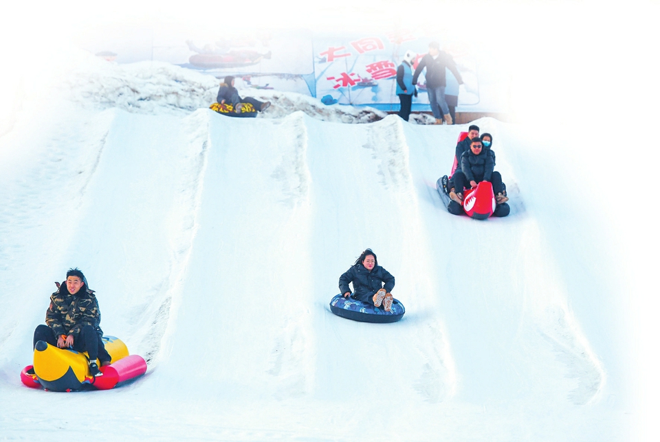 灵丘冰雪大世界,游客坐着雪圈直冲而下。