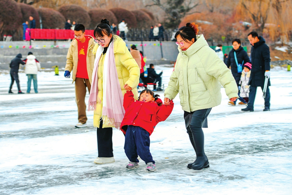 文瀛湖嬉冰场一位小姑娘在家人的陪同下滑冰。