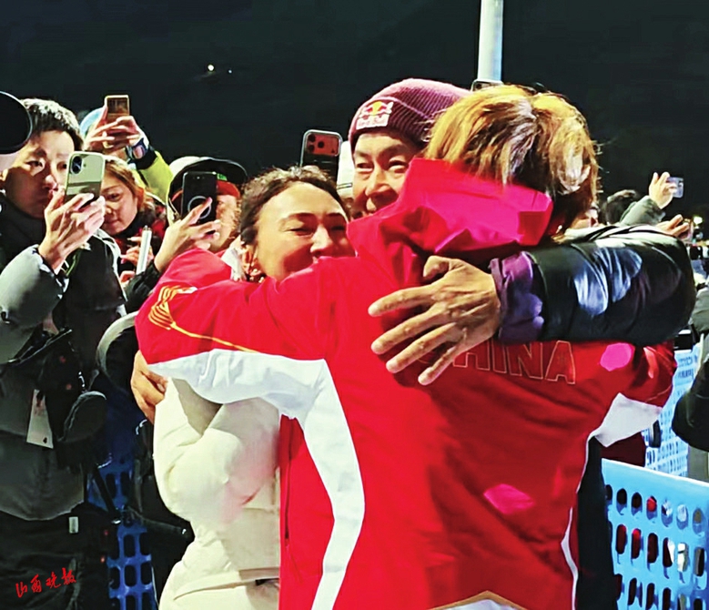 苏翊鸣赛后和父母拥抱。