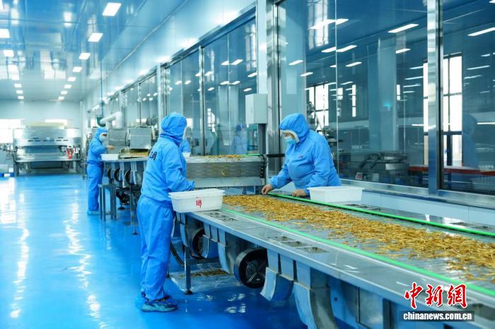 近日,山西大同,身着蓝色工装的工人在自动黄花挑拣线上,赶制春节黄花年货。 宋佳烨 摄