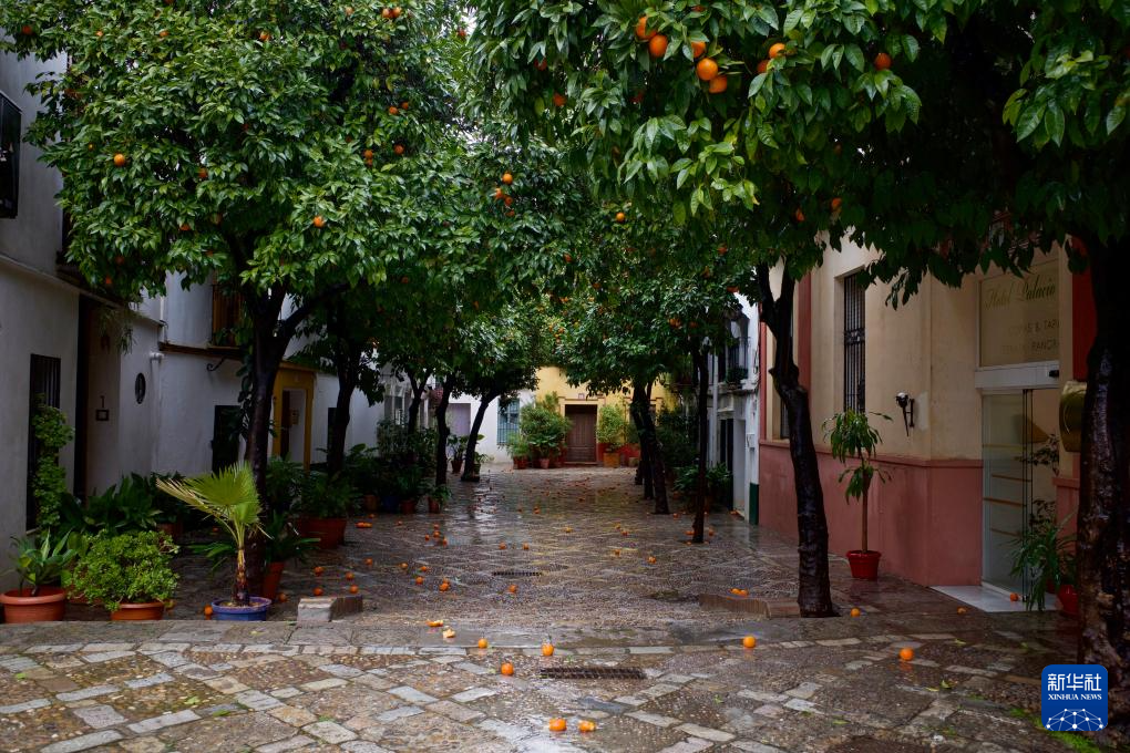 这是2月7日在西班牙塞维利亚拍摄的被强风吹落的橙子。