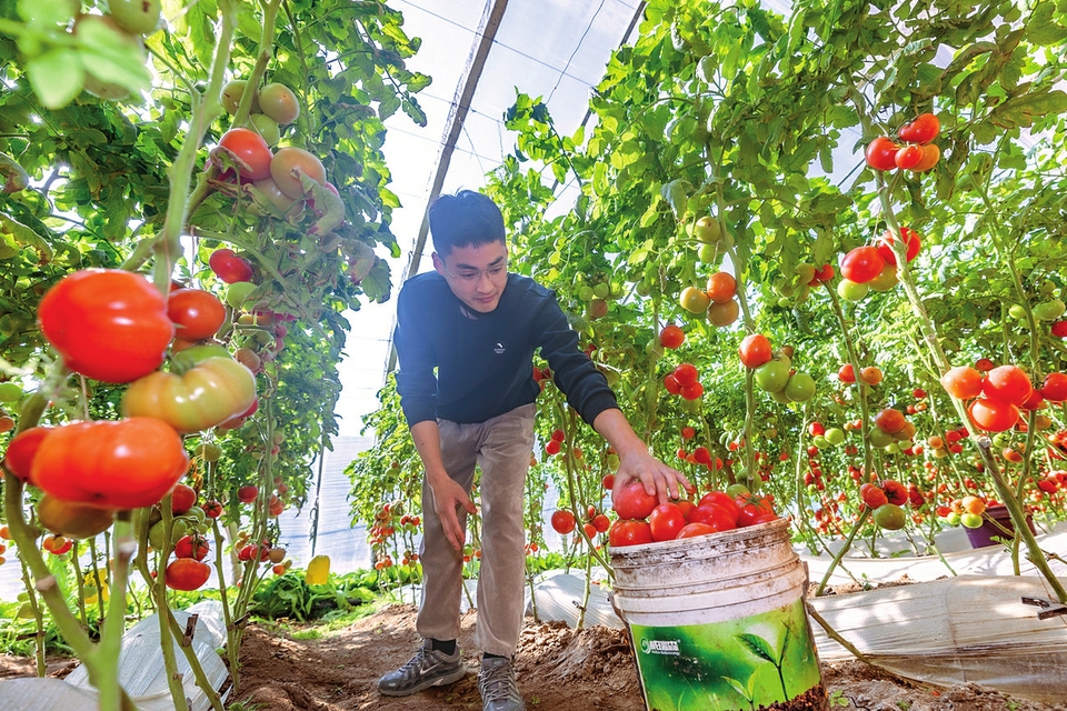 2月8日,运城市平陆县现代农业示范园温室大棚内,红彤彤的西红柿挂满藤蔓,农民忙着采摘、分拣,以及时投放春节市场。