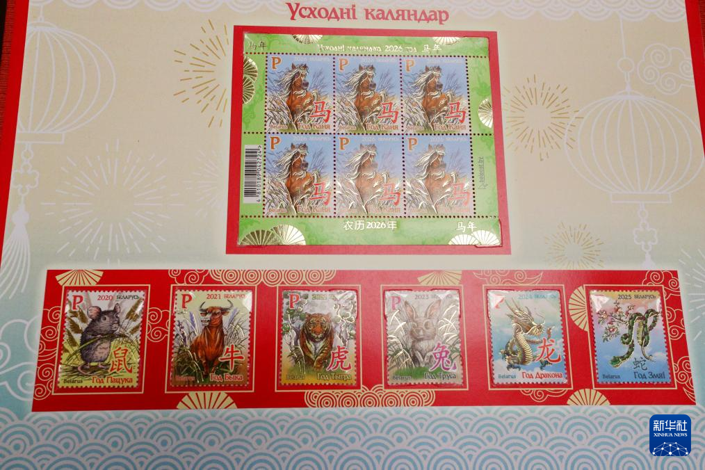 2月10日,在白俄罗斯明斯克,工作人员展示《东方历法:马年》邮票。