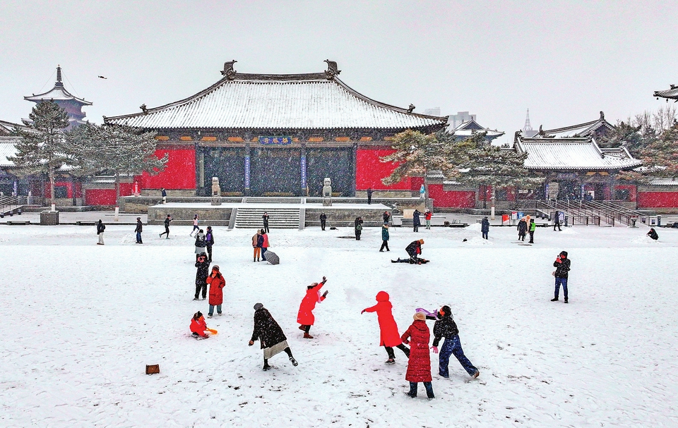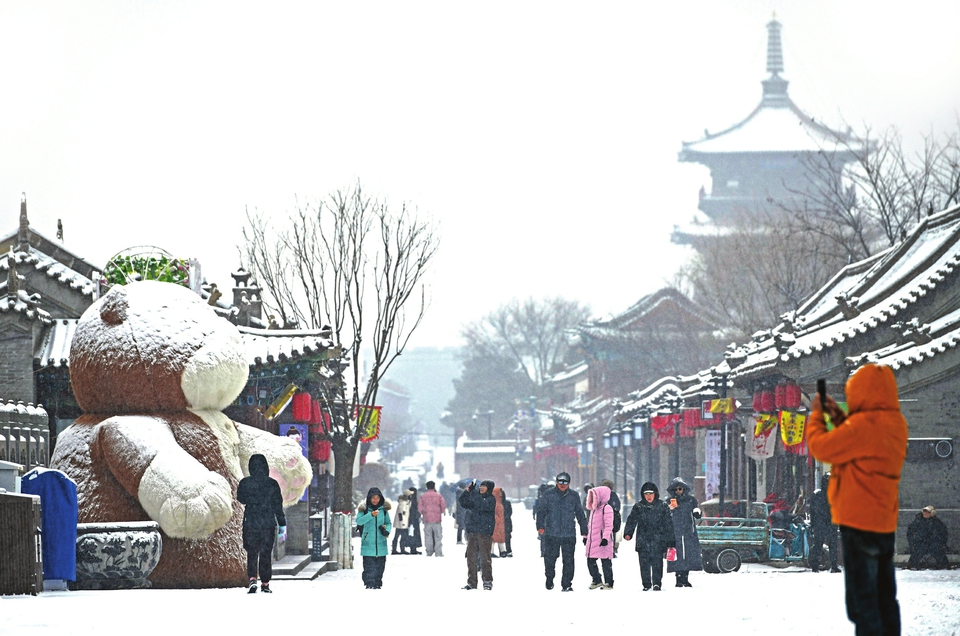 游客雪中漫步大同古城。