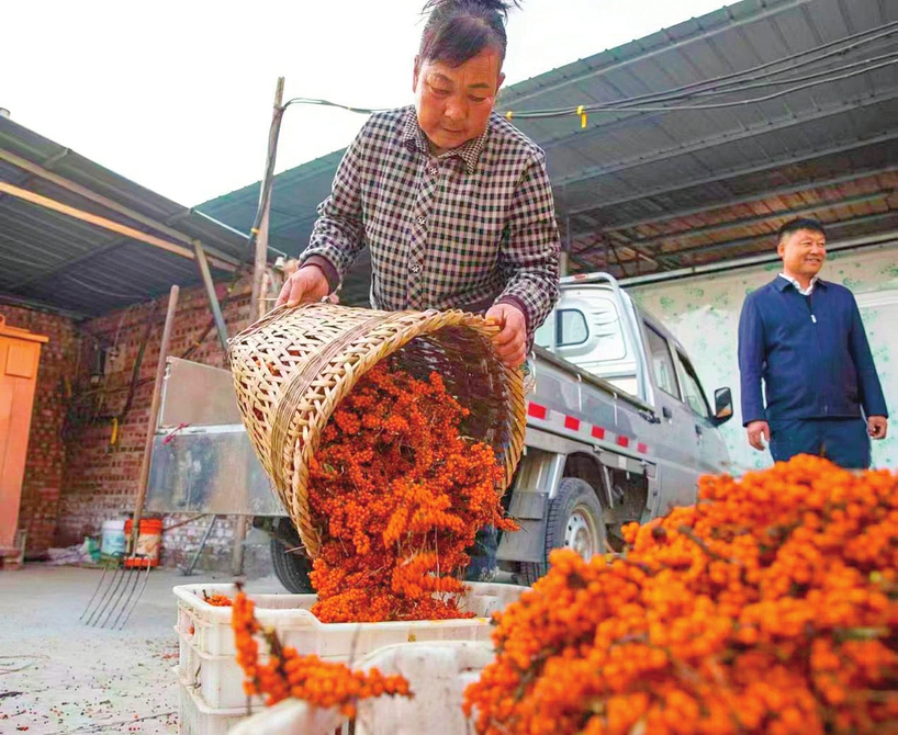 1月26日,在岚县界河口镇会里村,岚县林得财造林专业合作社内一片繁忙景象。负责人马云飞正忙着为前来送沙棘蛋的养殖户们过磅。
