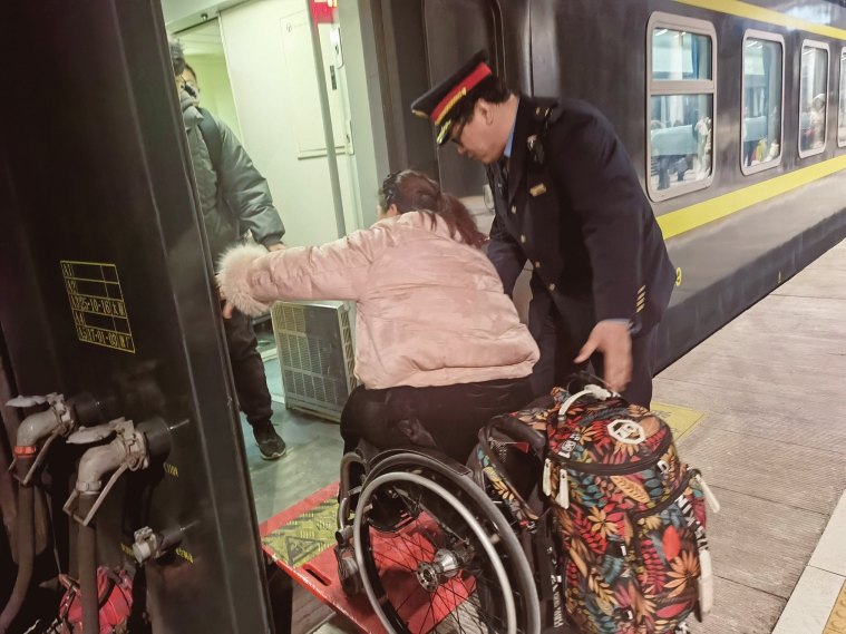 乘务员帮助轮椅旅客上车。