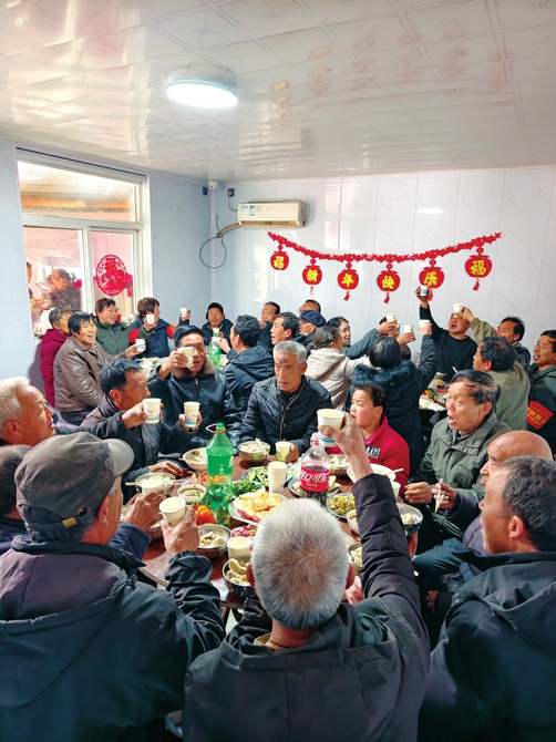 席间,宋光平端起桌上的饮料,招呼道:“今天是小年,咱们26户村民陪着海松一起过年,这是21年来的首次新春大团圆,祝海松健健康康,也祝咱们全村人新年快乐!”