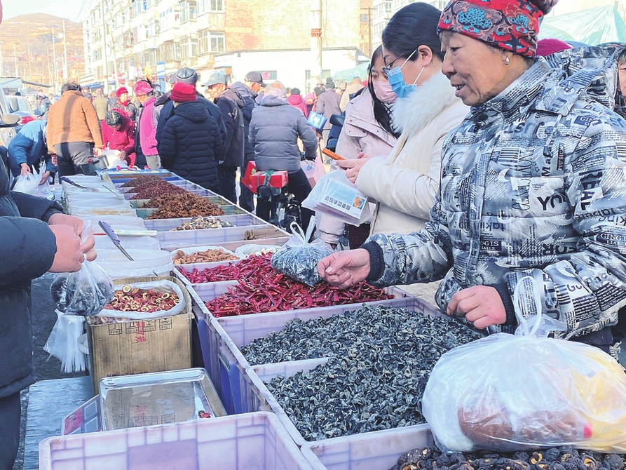 “张记牛羊肉”摊位前挂着整扇的羊肉、成条的牛肉,案板上剁肉的声音此起彼伏。经销户张建军说:“进入腊月,摊位每天可销售2头牛、10只羊。”一位中年妇女仔细挑选着牛腱子:“这个牛筋多,做酱牛肉有嚼头。再给我来几斤五花肉,过年炸丸子、做烧肉都得用。”