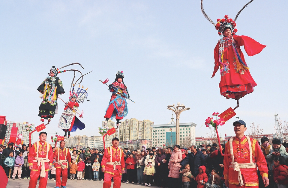 2月10日,阳城县凤城镇南关社区演出队在县文化馆门前广场上演省级非遗“扛桩故事”。桩上小演员化身戏曲人物凌空而立,桩下艺人踏着秧歌舞步娴熟演绎。 这项传承近四百年的民俗技艺,以“无言的戏剧”形式点亮马年新春,让现场市民沉浸式感受传统民俗的独特魅力,在欢腾氛围中喜迎马年新春。