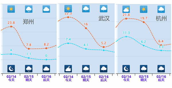 南北方多地都将经历冷暖快速切换,省会、首府、直辖市中,济南、郑州今天最高气温超过20℃,明后天降至7℃左右;武汉、杭州、长沙最高气温也从今天的20℃+到16日只有5℃至6℃。