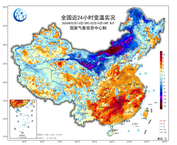 明天,江南以北大部地区气温将下滑,河南、山东、江苏等部分地区最高气温单日降温幅度可超过10°C,局地甚至可达20℃。16日(除夕),降温核心区域将进一步向南推进,贵州、湖南、江西、浙江、安徽等部分地区降幅将达12℃至22℃。