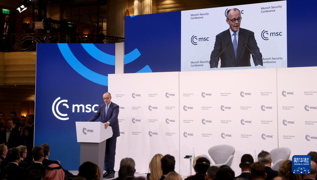 2月13日,在德国慕尼黑,德国总理默茨在第62届慕尼黑安全会议(慕安会)开幕式上致辞。新华社记者 李颖 摄