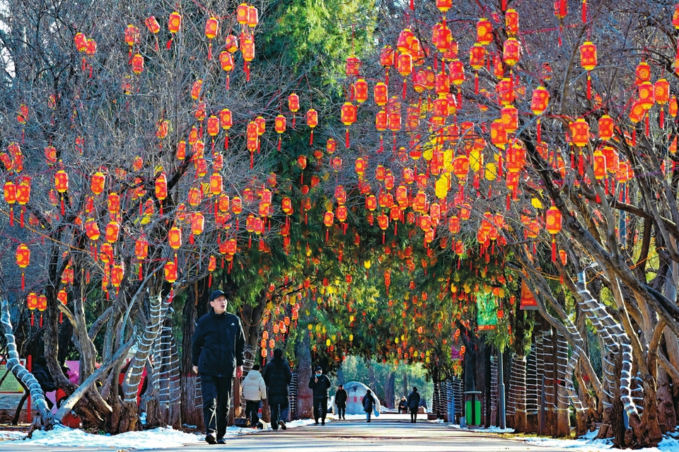 二月十四日,长治太行公园,市民从挂满红灯笼的树下走过。长治市街头巷尾处处张灯结彩,新春气息扑面而来。
