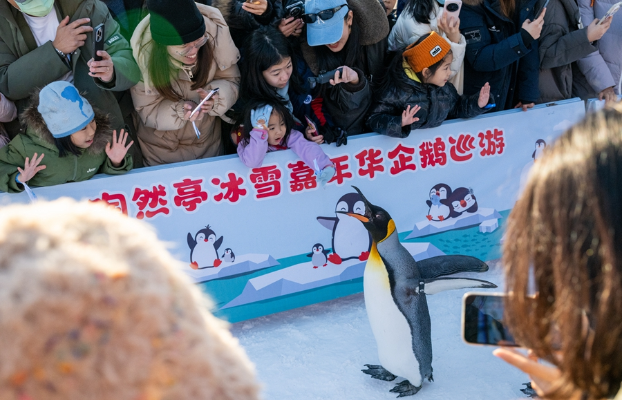 2026年1月,游客在北京市陶然亭公园冰雪嘉年华观看企鹅巡游。新华社记者 胡竞文 摄