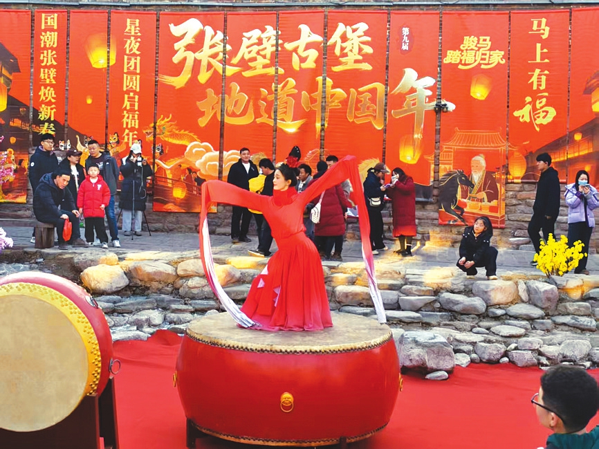 2月15日,张壁古堡景区内,红灯笼沿古巷蜿蜒伸展,马年主题的飘带与国潮纹样在风中摇曳,将古堡装点得喜气洋洋。今年春节,景区推出以“国潮张壁焕新春,星夜团圆启福年”为主题的第九届地道中国年活动。