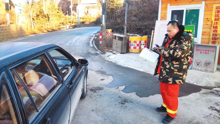 行至观家峪护林防火检查站,隔离墩一字排开,防火码标识格外醒目。值守人员走上前来礼貌核查:“您好,请扫码登记,接受火种检查。”