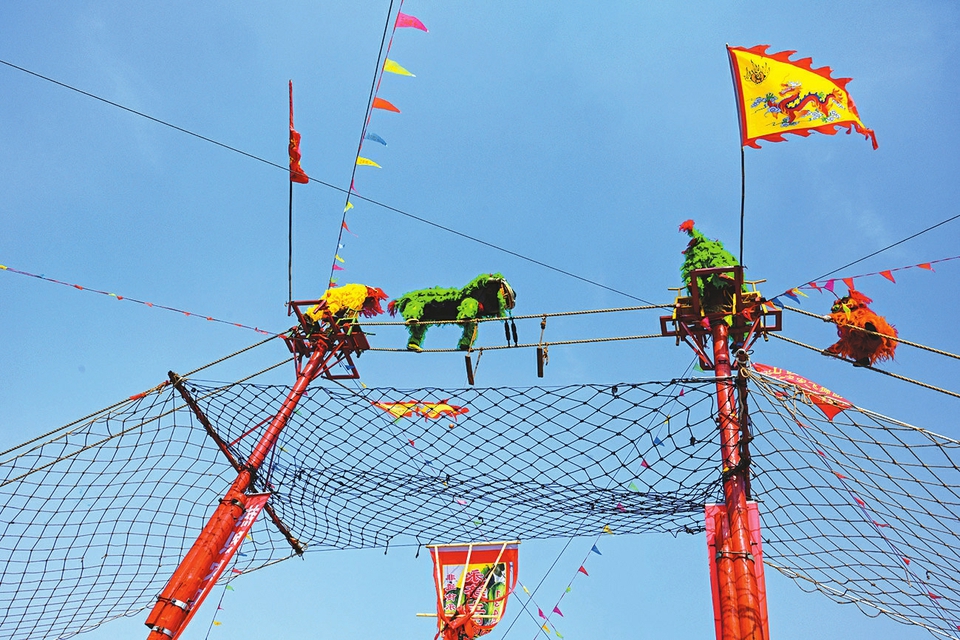 2月17日,永济市南山舜帝广场锣鼓震天,由永济市土乐村村民组成的非遗飞狮演艺团进行高空舞狮表演,欢度佳节。