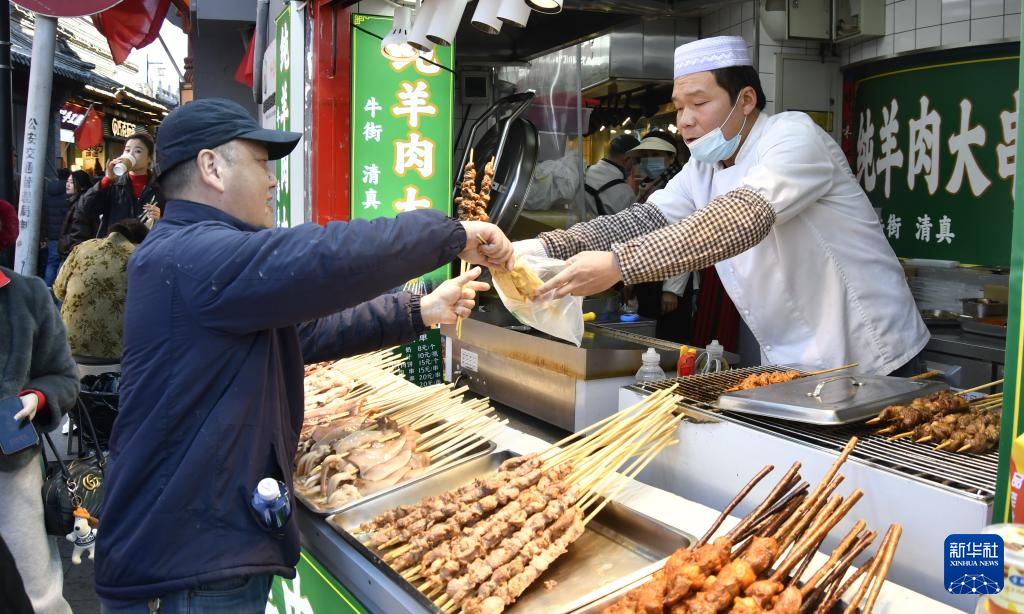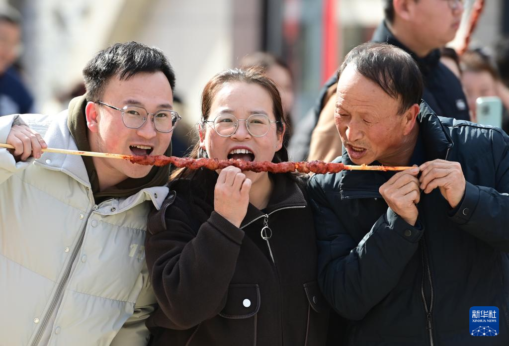 2月18日,在陕西延安的金延安街区,游客在品尝大串烤肉。新华社发(祁小军摄)
