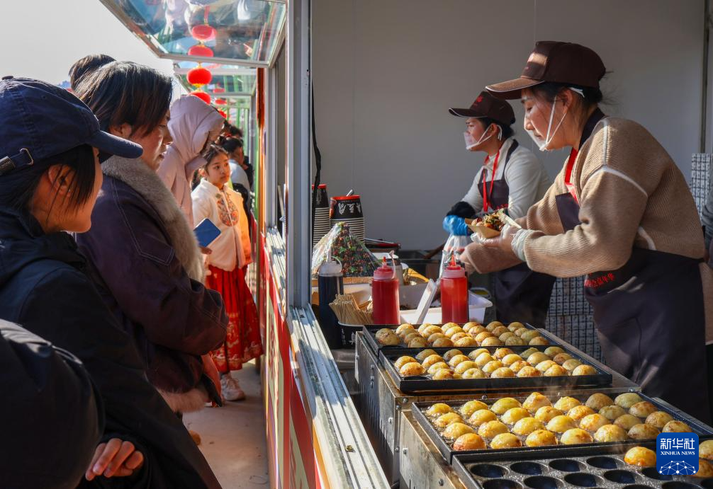 2月18日,在江苏省兴化市莲溪湖公园,市民和游客在特色小吃市集选购、品尝特色小吃。新华社发(史道智摄)