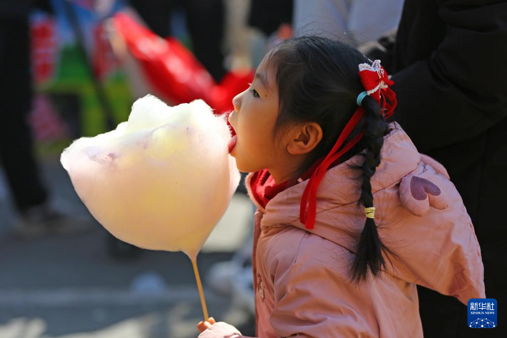 2月17日,在山东省滕州市荆河公园,一名小朋友在品尝棉花糖。新华社发(李志军摄)