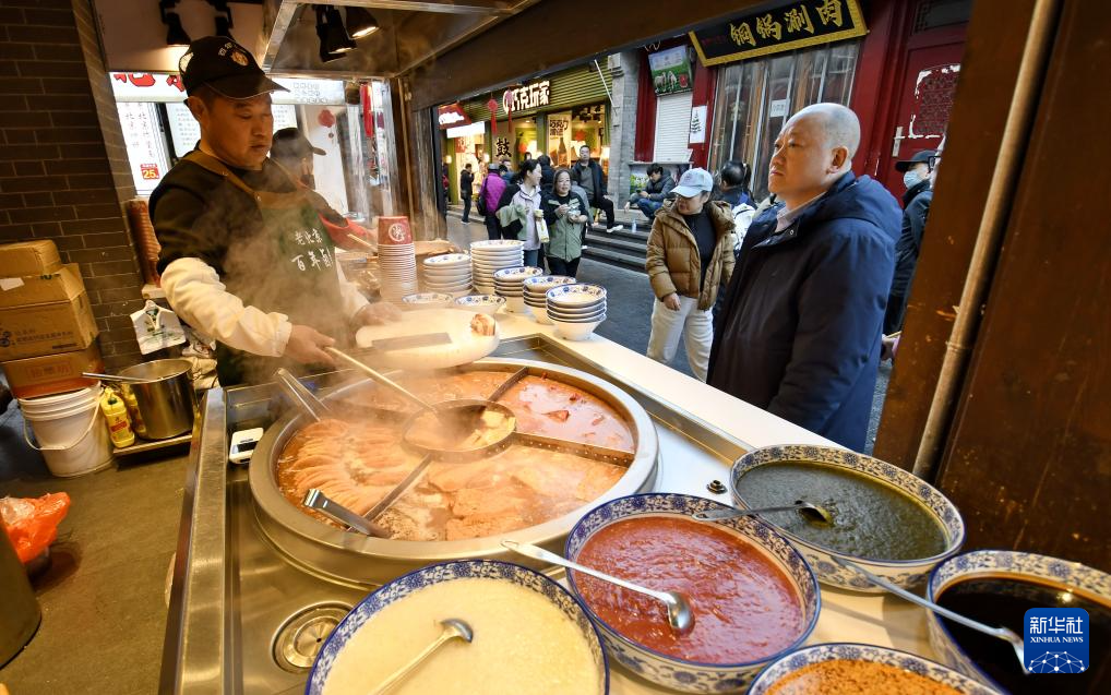 2月18日,游客在北京烟袋斜街品尝美食。新华社记者 李欣 摄
